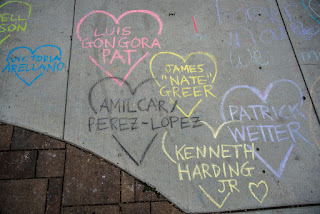 From the church, Yanira's parents Carmen Garcia and Ignacio Serrano, joined Tony to lead a march downtown, Along the way, activist Lisa Ganser wrote on the street with chalk the names of other individuals who were also killed by the police in the Bay Area. Several children joined in helping to create the chalk art.